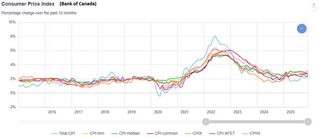 The Bank of Canada began 2025 with the Bank Rate at 3.5% after a historically unprecedented rise from near-zero COVID-era rates in 2022 and 2023. Rates had been allowed to settle back toward the 20-year average during 2024, and the Bank made 4 further cuts of 0.25% each during 2025, as inflation has remained in the 1-3% target band and unemployment has remained steady.